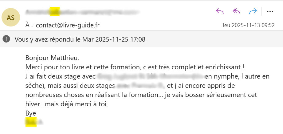 Si vous n'êtes pas encore convaincu de l'intérêt de suivre une formation, ou si vous préférez commencer par une approche plus modeste, vous pouvez toujours vous procurer mon livre « Apprendre et maîtriser la nymphe au fil en quelques heures » dans un premier temps.